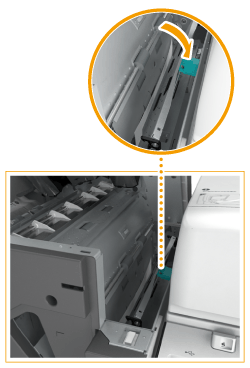 The pressing unit is for ensuring a clean fold in the center of the paper to create a booklet. If the pressing unit is not in its proper position, the paper to be saddle stitched cannot be fed to the booklet tray.