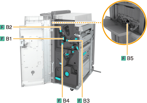 Turn the knobs (F-B3, F-B4) to feed the jammed paper to the output slot.