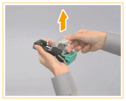 Hold the green lever of the staple case, and pull it out straight toward you.