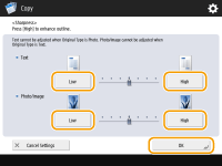 To reduce moire when copying documents that contain printed photos, such as magazines or pamphlets, adjust the control in <Photo/Image> to <Low>.