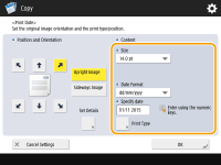 If you want to make the dates into watermarks, press <Print Type>. You can adjust the density of the characters by selecting <Transparent>. Select <Overlay> to print the dates with the normal copy density.