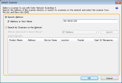Click [Specify Address] and enter the IP address or host name of the machine in the [IP Address or Host Name] text box.