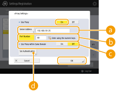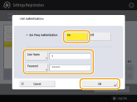 To use the proxy server authentication function, press this and configure the authentication information. On the screen that is displayed, press <On>, enter the user name and password to use for proxy authentication, and press <OK>.