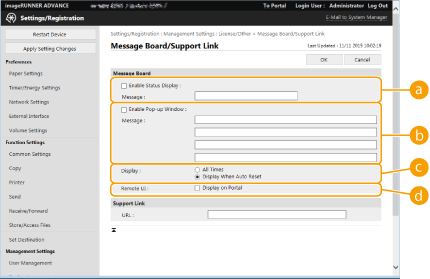 You can display messages to users on the touch panel display. Messages can be displayed at the bottom of the touch panel display or in a separate pop-up window, and you can select which display method to use based on the type of message or user. When a message is displayed in a pop-up window, you can also display the same message on the Remote UI portal page. Administrator privileges are required in order to configure these settings.