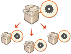 Various machine settings (device information) can be sent over the network and automatically applied to other Canon multifunction printers. With this function, you can designate a host machine whose registered information (such as the settings in the Settings/Registration menu and address lists) is distributed to other client machines, enabling you to configure the same settings as the host machine. This makes it easier to incorporate new multifunctional printers into your system, and it enables you to operate multiple machines with the same settings, which simplifies management operations even when you increase the number of machines. For more information on the machine information that can be distributed, see Settings/Registration.