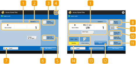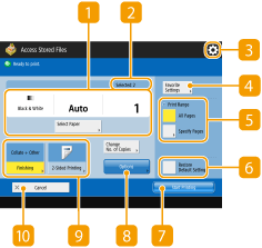 When you press <Access Stored Files> on the Main Menu, and then press <Mail Box>, <Advanced Box>, <Network>, or <Memory Media> to print files, the following setting screen is displayed.