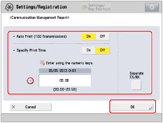 When the message <Check the printer. Call service representative.> is displayed to indicate that the Print function is unavailable, the machine automatically prints a Communication Management Report after it recovers from the problem. The latest 100 communication logs are printed on the report.
