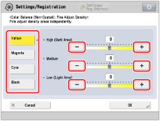 Select the color that you want to adjust → press [-] or [+] to adjust the density level for the darker (high), medium, and lighter (low) density areas.