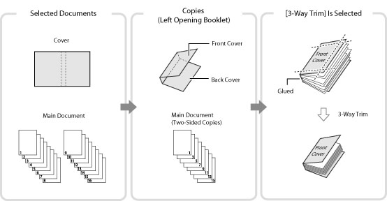If you are using paper from 20 lb bond to 28 lb bond (80 g/m2 to 105 g/m2) for the main document and the output is more than 150 sheets, the booklet may not be made because of its thickness. In this case, a paper jam may occur. Reduce the number of pages in the main document.