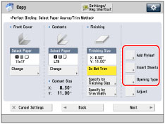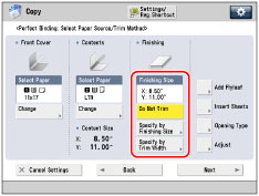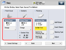 If you set a different paper size for the front flyleaf, back flyleaf, or insert sheets, the paper sizes for the other features are automatically changed to the new paper size. However, changing the paper source for a feature to a source with the same paper size does not change the settings for the other features.