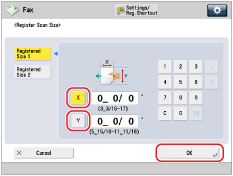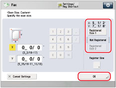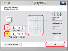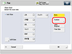 (Main Menu) → [Fax] → press the scan size button.