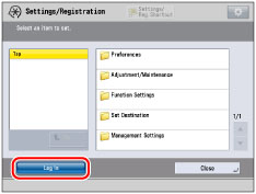 Some items on the Settings/Registration screen may be restricted for general users. Items that a user does not have operating privileges for are grayed out and cannot be selected on the touch panel display. Items that a user does not have operating privileges for are not displayed on the Remote UI.