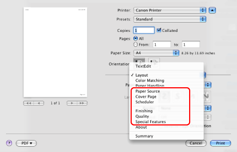 If the above functions cannot be set in the upper part of the [Print] dialog box, display and set them in the [Copies & Pages] preferences pane or the [Page Setup] dialog box.