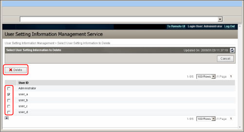 You cannot delete the user setting information for the user who is logged in as an administrator.