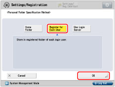 In this procedure, select [Register for Each User] to specify the personal folder.