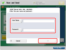 Enter the user name and password used for LDAP Server authentication → press [OK].