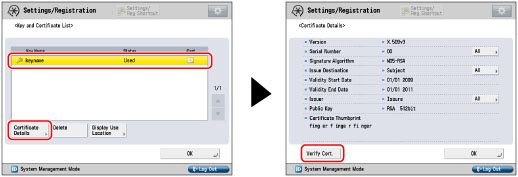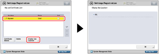 Key pairs for which 'Used' is displayed in <Status> cannot be deleted because they are being used with the IEEE802.1X authentication/IPSec or because SSL is set to 'On'. Press [Display Use Location] to check the type of security the key pair is being used for. To delete a key pair which is only being used with SSL, set the following settings to 'Off'. A key pair being used for IEEE802.1X authentication/IPSec cannot be deleted.