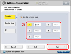 Press [Set Auto Distribution] for <Transmitting Settings> → select [Everyday] or [Specify Days].