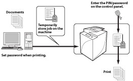 You can print out documents (print data) that have been assigned a PIN and sent to this machine from a computer.