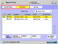 If you are logged on as the SSO-H administrator, jobs sent by all users are displayed, and you can view the details of or cancel the jobs. However, secured documents and encrypted secured documents can only be printed by the user that sent them.