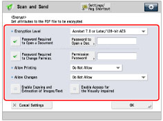 * Appears only if you select [Acrobat 9.0 or Equivalent] in [256-bit AES Settings for Encrypted PDF] in [Function Settings] (Settings/Registration). (See "Changing the PDF Encryption Level from Acrobat 10.0 or Equivalent to Acrobat 9.0 or Equivalent.")
