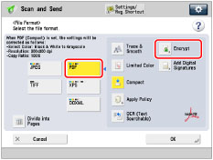 This mode can be used only if an e-mail address or file server is specified as the destination. If you specify a fax number, I-fax address, or mail box as the destination, you cannot send the job as an encrypted PDF file.