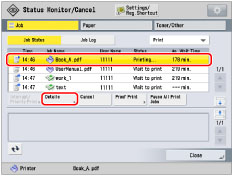 If you select a print job and press [Details], press [Paper Feed] to forcibly print the print data remaining in the memory, and press [Skip Error] to temporarily disable errors and continue printing. [Paper Feed] and [Skip Error] can only be used for print jobs sent from the computer.