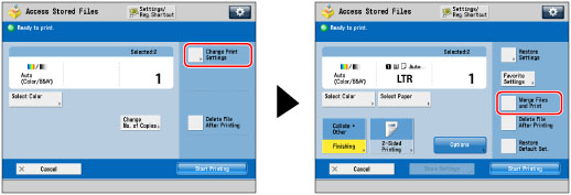 If you use the Merge Files and Print mode to merge and print multiple files, the files are printed using the default settings for Access Stored Files instead of the individual settings of the respective files. However, the settings of each file are not changed or deleted, and remain the same as when the file was created.