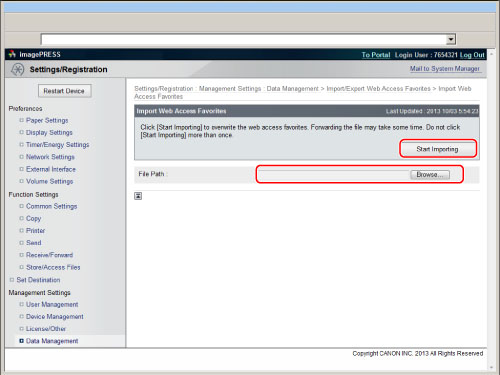 » Web Access » Using Favorites » Exporting/Importing Favorites as a File » Importing Favorites from a Computer File