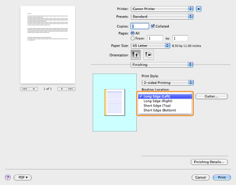The default setting for [Print Style] is [2-sided printing]. You can save the 1-sided printing setting as a preset. For details, see "Using [Presets] for Printing."