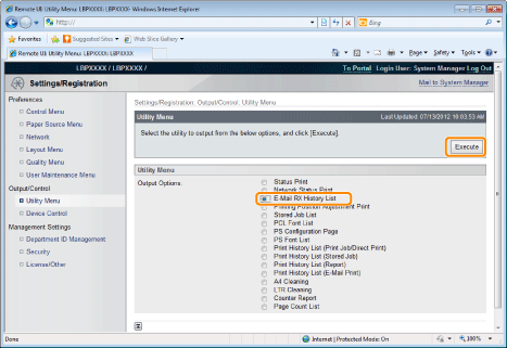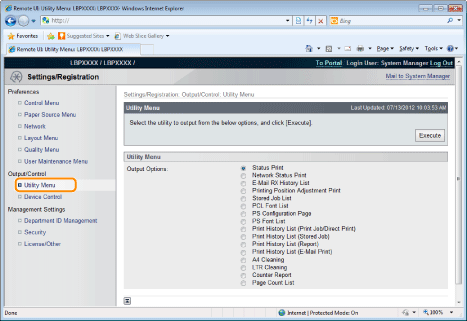 Click [Utility Menu] under [Output/Control] in the [Settings/Registration] menu.