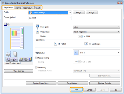 Click the tabs for the [Page Setup], [Finishing], [Paper Source], and [Quality] tabs, and then specify the desired items.