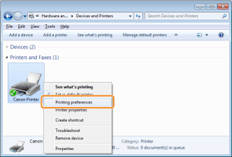 Right-click the icon of the printer whose settings you want to specify → click [Printing Preferences] (or [Printing preferences]).