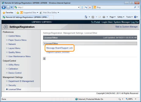 From the [Settings/Registration] menu, select [Message Board/Support Link] in [License/Other] under [Management Settings].