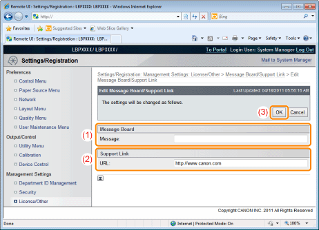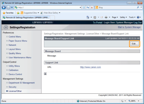 You can post messages from the administrator on a message board on the portal page of the Remote UI. Also, you can set links to information about printer support in the portal page support link, and make it accessible from the Remote UI when necessary.