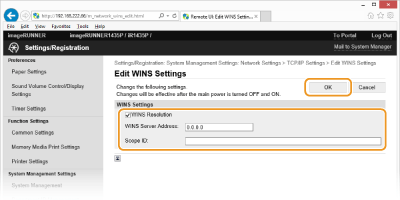 Select the [WINS Resolution] check box, specify the required settings, and click [OK].