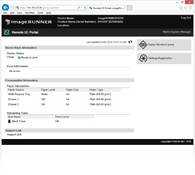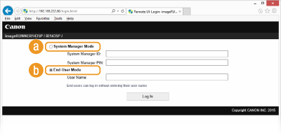 You can perform all the Remote UI operations and configure all the settings. Enter the appropriate ID in [System Manager ID:] and PIN in [System Manager PIN:] (