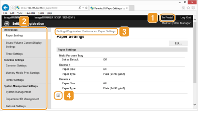 Displays the [Settings/Registration] page. When you are logging on in System Manager Mode, you can change the settings and export/import the registered data.