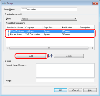 You can also edit previously registered group destination information. For more information, click [Help] in the bottom right-hand corner of the fax driver window to view Help.