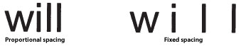 Each character has a different width from all the other characters in a font at a given point size. For example, W is a wider letter than I. There are two ways to print letters of different widths: you can print all letters with the same spacing, regardless of their actual width; or you can change the spacing between letters to accommodate these different widths. Printing all letters with the same spacing is called Fixed spacing, while changing the spacing to accommodate different letter widths is called Proportional spacing.