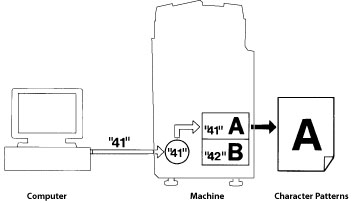 When you print the letter A, the host computer sends a code corresponding to A (hexadecimal 41 is an example of this) to the machine. This code is referred to as the character code. The machine stores an internal representation of each character, and selects from among these character patterns the pattern corresponding to the received code. In this case, the machine searches for the pattern for A, and prints it. The process by which letters are printed.