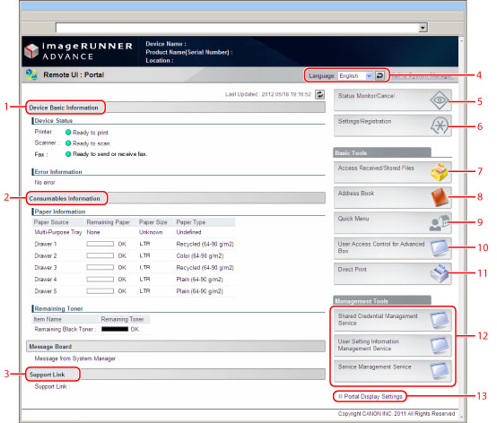 You can change the language displayed on the screen by selecting the desired language on the portal page, regardless of the language used on the touch panel display of the machine.