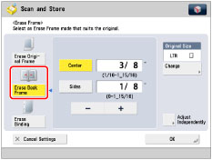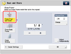 This mode enables you to remove the shadows and lines that appear when scanning various types of originals. There are three types of Erase Frame: [Erase Original Frame], [Erase Book Frame], and [Erase Binding].