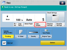 [Copy Sample] appears only if you set to make multiple copies of your original in [Collate (Page Order)], [Offset], [Rotate 90 Degrees], [Staple], [Add Cover], [Insert Sheets], [Booklet], or [Transparency Cover Sheets].