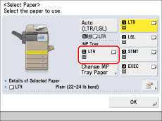 Icons indicating the type of paper loaded in each paper drawer can be displayed on paper selection screens, if you store that information into the machine beforehand. (See "Registering/Editing Custom Paper Types.")