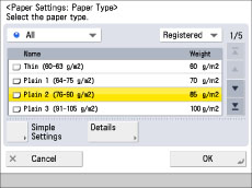 You can register paper types if paper types for the loaded paper are not displayed on the detailed setting list. For instructions on registering paper types, see "Registering/Editing Custom Paper Types."
