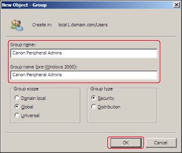 In the [New Object - Group] dialog box, enter the group name ('Canon Peripheral Admins') → click [OK].
