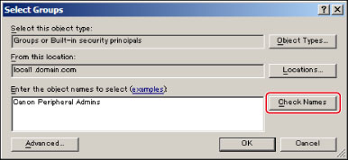 Enter 'Canon Peripheral Admins' in the group selection dialog box → click [Check Names].