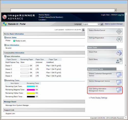 To specify each setting for User Setting Information Management Service, it is necessary to access and then log in to the machine from the Web browser. This section describes the procedure for accessing the machine from the portal page of the Remote UI.