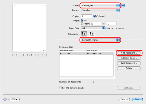 Select your fax → [General Settings] → click [Add Recipient].